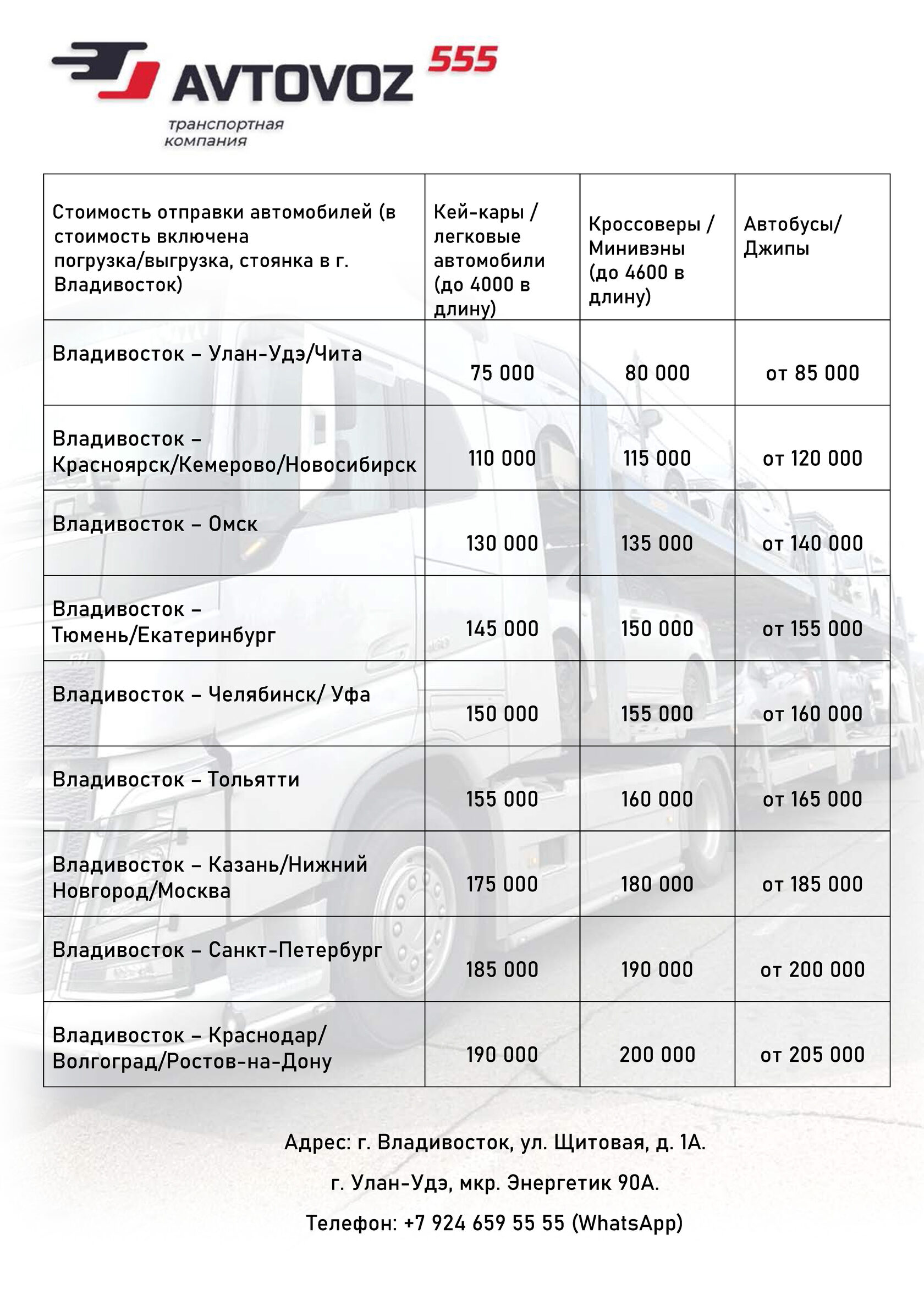 Телефон: +7 924 659 55 55 E-mail: avtovoz_555@mail.ru г. Владивосток, ул. Щитовая, д. 1, оф. 1. г. Улан-Удэ, мкр. Энергетик, д. 90а.